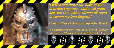I was thinking that a fielding a Squad of these Iron Warriors "Automatons", painted up in Imperial Fists Space Marine colors, would be a thematically "fluff-appropriate" way of representing Thousand Sons Rubric Marines within an Iron Warriors Grand Company. It would also be an ironically fitting (albeit perverse) tribute to the ten thousand years of HATE that the Sons of Perturaubo have for the Ancient Enemy! And, on top of that, it would also serve as an appropriate little "knife-in-the-gut" to any deluded Lapdogs of Dorn that one might face on the tabletop...